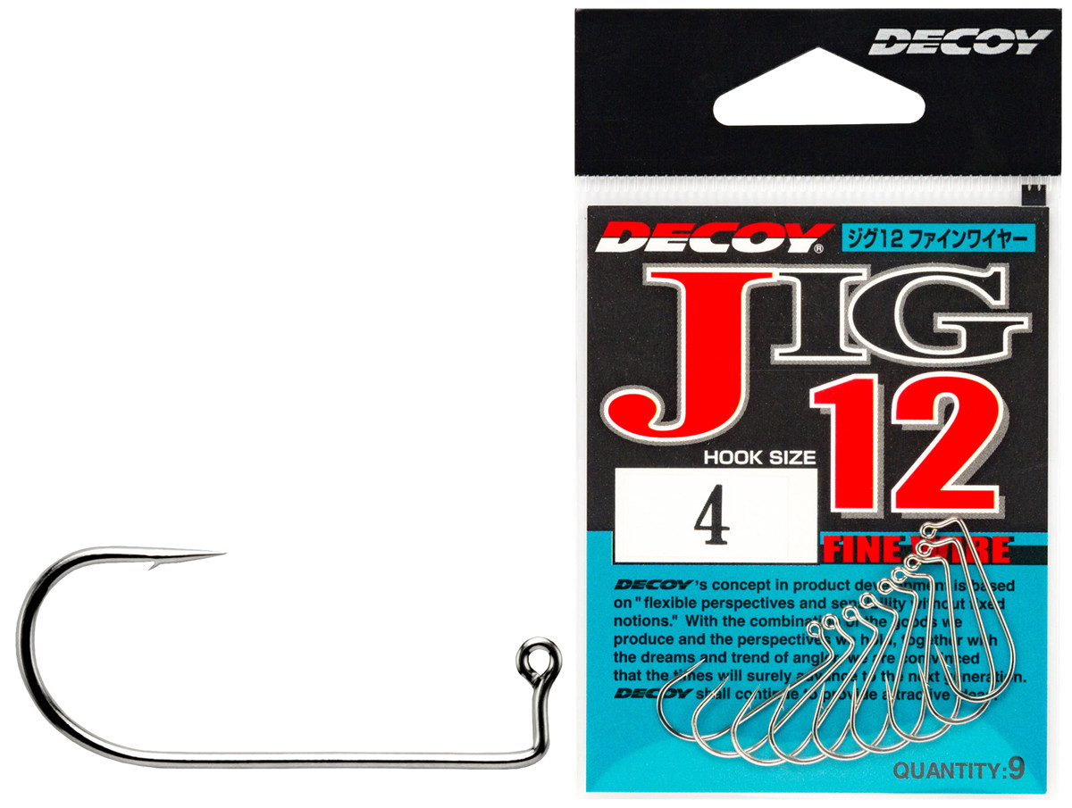 Гачок Decoy JIG12 Fine Wire застосовується для самостійного виготовлення джиг головок. Він виготовлений із досить тонкого дроту, тому підійде для лову дрібної та середньої риби снастями класу лайт і медіум. Класичний круглий вигин є оптимальним як для насаджування силікону, так і для засікання й утримання риби. Якісне хімічне заточування від японського виробника зберігає свою гостроту впродовж тривалого часу навіть після контактів із підводними перешкодами. Джиговий гачок Decoy JIG12 Fine Wire має світле нікельоване покриття, тому підійде для риболовлі як у прісній, так і в солоній воді.