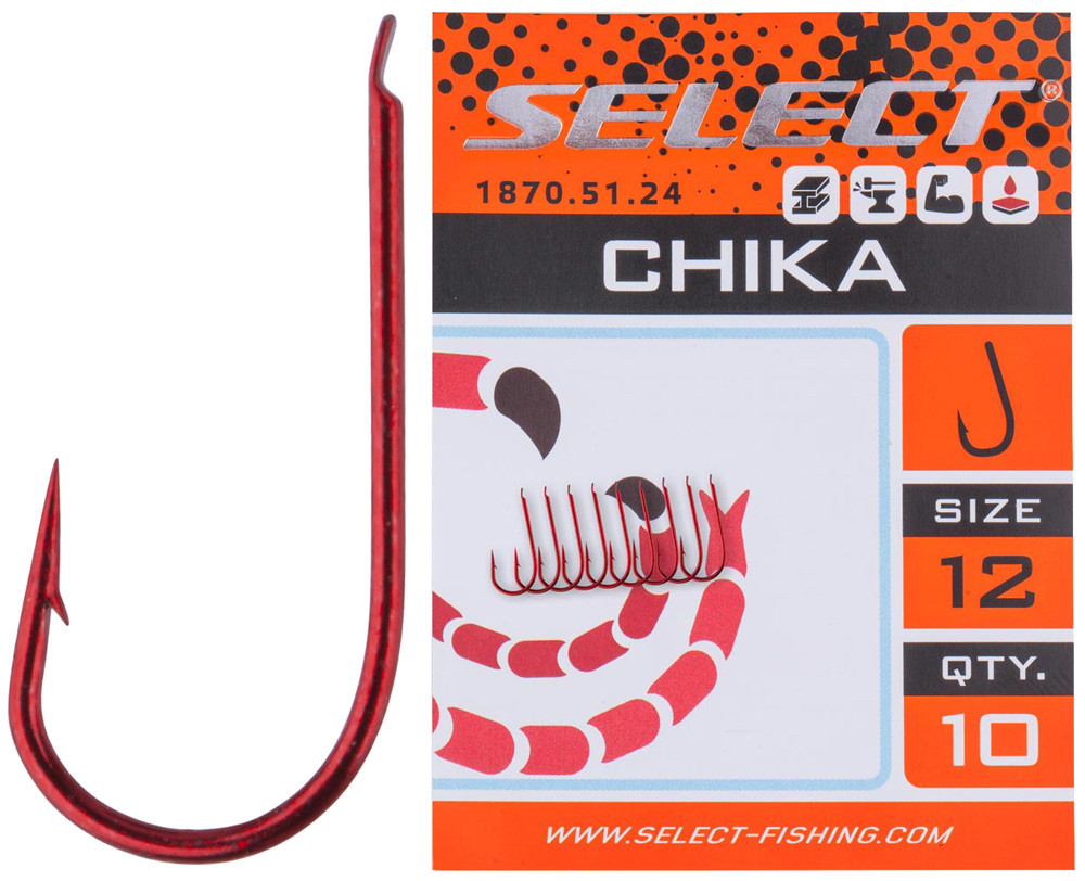 Select Chika — ідеальний гачок для лову обережної риби оснастками з тонкими повідцями. Чудово підходить для лову на мотилю, а також будь-яких інших тварин наживок. Також використовується для лову з льоду.