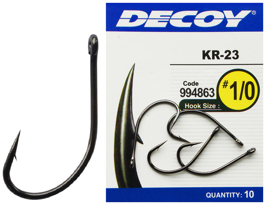 Гачок Decoy KR-23 має подовжену цівку та виготовлений із дроту збільшеного діаметра. Довге тонке жало легко встромлюється в риб’ячі губи, а особлива форма вигину розподіляє навантаження, що виникає під час виведення великої риби так, що розгинання гачка зводиться до нуля. Ця модель знайде своє застосування у фідерній і короповій ловлі з використанням як живих, так і рослинних насадок.