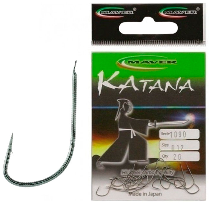 Гачок Maver Katana 1090 чудово підійде як для лову дрібної, так і для ловлі трофейної білої риби, як-от карась, плітва та лящ. Міцність і пружність виробу забезпечується завдяки застосуванню вуглецевої сталі. Діаметр дроту змінюється залежно від номера гачка. Заточення проходить за сучасною технологією, що ґрунтується на хіміко-механічному процесі. Широкий зачеп і спеціальна форма гачка гарантують потрібний напрямок під час підсікання. Жало подовжене, завдяки чому в рибалки з’являється більше шансів утримати рибу під час виведення, також має більший кут, який спрямований до цівки. Завдяки такій формі забезпечується ефективніша реалізація клювання. Гачки цієї серії чудово себе зарекомендували в поплавцевій і у фідерній ловлі під час роботи з насадками тваринного та рослинного походження. Гачок Maver Katana 1090 випускається в нікелевому, бронзовому та чорному кольорах і безлічі розмірів.
