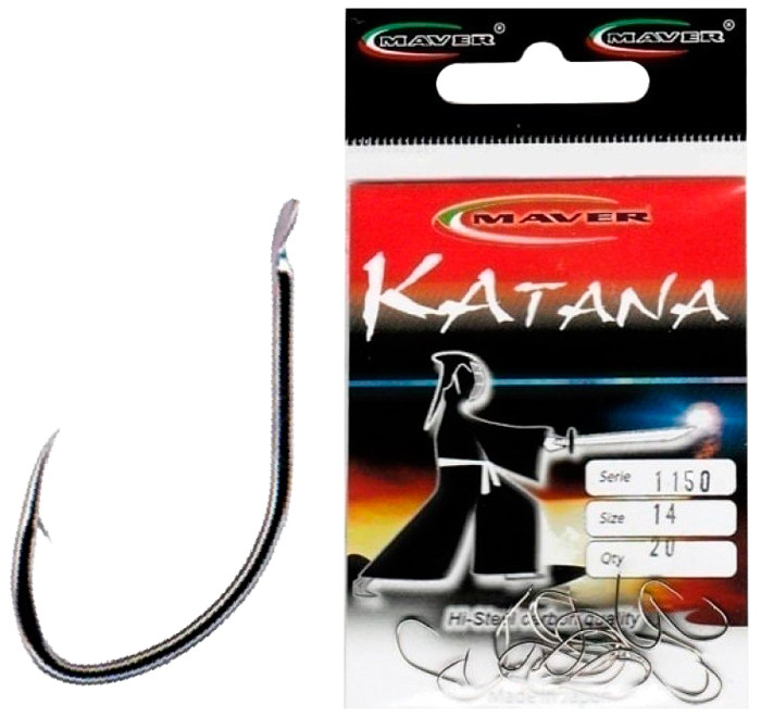 Гачок Maver Katana 1150A — серія висококласних одинарних гачків японського виробництва. Модельний ряд містить кілька розмірів, що застосовуються у фідерній і всіх видах поплавцевої ловлі. Вироби виготовлені з високовуглецевої сталі, що має оптимальні механічні властивості, що дають змогу гачку пружинити, не розгинатися й не ламатися під навантаженням. Особлива форма підчеплення Katana 1150A забезпечує гарну засікість і надійне утримання великої риби. Конструкція з лопаткою.