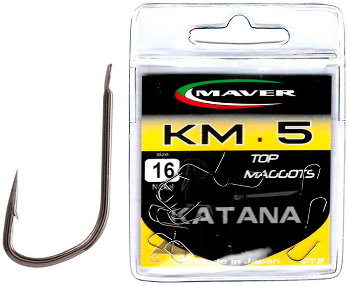 Гачок Maver Katana Match Serie KM5 спеціально розроблений для використання з такими наживками, як-от опариш і пінка, чудово підійде для шанувальників поплавцевої та фідерної ловлі. Під час виробництва використовується вуглецева сталь, завдяки цьому досягається максимальна міцність і пружність продукту. Жало подовжене та трохи спрямоване в бік цівки, гарантує потрібний напрямок під час підсікання та дає більше шансів утримати рибу під час виведення. Заточення виробляється за сучасною технологією, що ґрунтується на хіміко-механічному процесі. Діаметр дроту змінюється залежно від номера гачка.