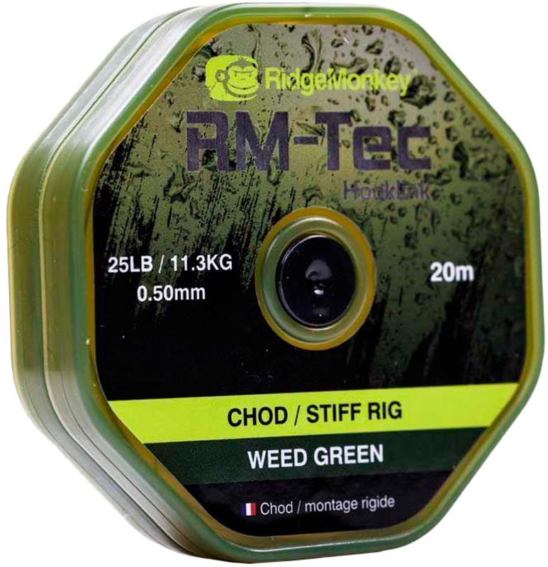 Повідцевий матеріал RidgeMonkey RM-Tec Chod/Stiff Rig Material — дуже міцна та жорстка нейлонова нитка з великою пам’яттю. Випускається з забарвленням Weed Green у розмотках по 20 метрів і з розривними навантаженнями 20 і 25 фунтів.