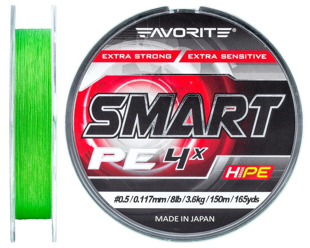 Favorite Smart PE 4x — перший шнур, випущений під торговою маркою Favorite, який призначений задовольнити всі базові потреби більшості рибалок. Виготовлений із чотирижильного матеріалу H-Grade PE, що має високу міцність, як на прямій ділянці, так і на вузлі, оптимальну м’якість і гарну абразивостійкість. Також у цьому шнурі застосовані додаткові технології, що покращують його характеристики: Si-coating (silicone coating) — спеціальне силіконове покриття, що робить його поверхню гладкішою і слизькішою, що неабияк зменшує тертя в кільцях, збільшує дальність закидання та водовідштовхувальні властивості; LP (lifetime painting) — спеціальне фарбування шнура, яке забезпечує його яскравий колір на довгий час.Шнур Favorite Smart PE вироблено в Японії, що, безумовно, говорить про його високу якість, а невисока ціна дає змогу сміливо назвати цю модель найкращою на ринку України за співвідношенням ціна — якість.Smart PE завдяки своїм характеристикам знайде своє застосування в спінінговій ловлі, як у новачків, так і в професіоналів.