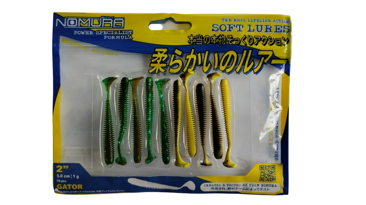 Искусственные мини-«аллигаторы» из съедобного силикона NOMURA GATOR выпускаются в 10 различных светлых и темных цветовых оттенках, но во всех моделях обязательно присутствуют вкрапления микроблесток, которые во время рыбалки должны помочь вам расшевелить и заставить начать клевать даже малоактивную и капризную хищную рыбу в пасмурную/ненастную погоду или, когда силиконовый тонкотелый ребристый виброхвост NOMURA GATOR во время проводки находится на большой глубине.