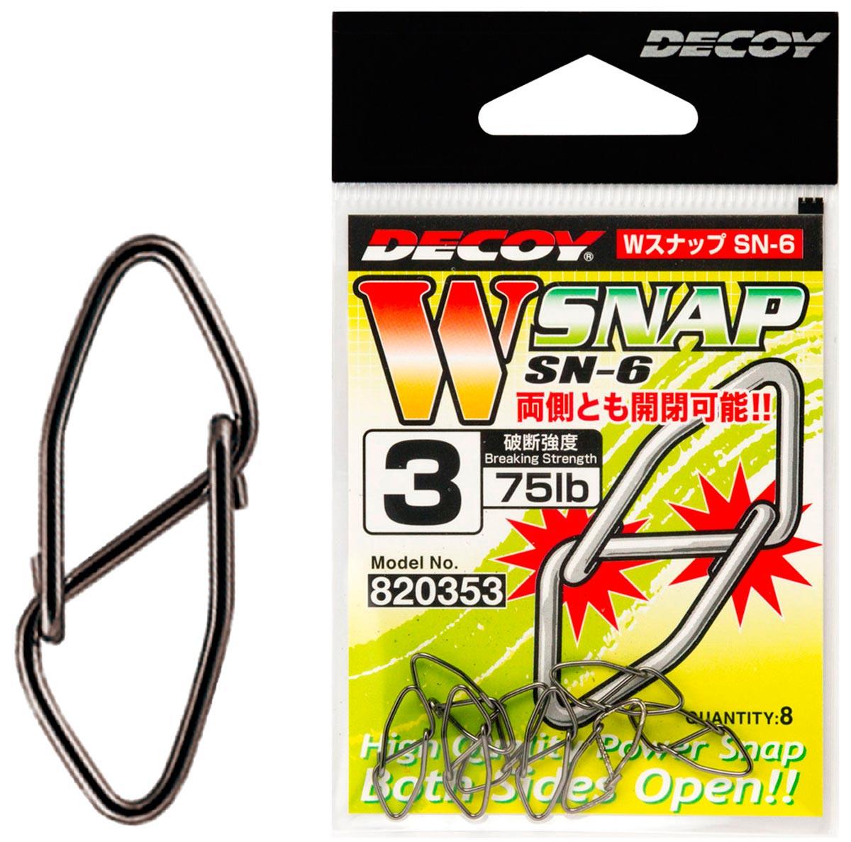 Застібка Decoy SN-6 W Snap вирізняється підвищеною міцністю. Конструкція дає змогу однаково зручно відкривати та закривати її з обох боків. Це зручно, якщо необхідно додати додатковий елемент обладнання, наприклад вертлюг. V-подібна форма запобігає сповзанню вузла й дає змогу витримувати високі навантаження. Ця застібка не має витичних назовні елементів, тому під час закидання за неї не чіплятиметься волосінь, а також різні водорості під час проведення приманки. Decoy SN-6 W Snap ідеально підходить для всіх різновидів спінінгового лову, а також може використовуватися у фідерній і короповій риболовлях.